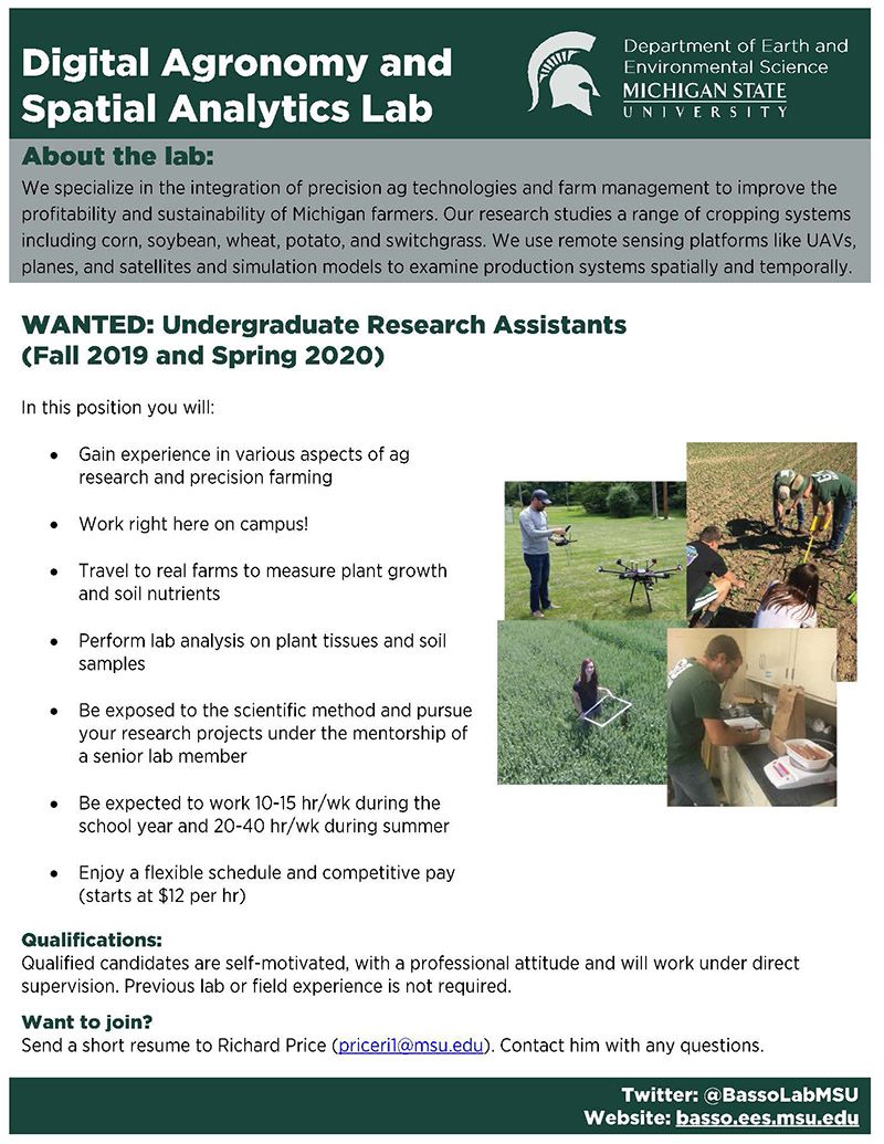 In this position you will:· Gain experience in various aspects of ag research and precision farming · Work right here on campus! · Travel to real farms to measure plant growth and soil nutrients · Perform lab analysis on plant tissues and soil samples · Be exposed to the scientific method and pursue your research projects under the mentorship of a senior lab member · Be expected to work 10-15 hr/wk during the school year and 20-40 hr/wk during summer · Enjoy a flexible schedule and competitive pay (starts at $12 per hr) |